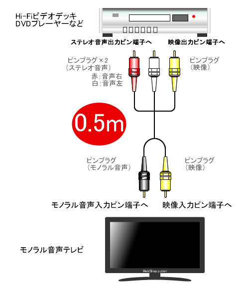 ビデオコード/ビデオケーブル ピンプラグ×2(映像+モノラル音声)←→ピンプラグ×3(映像+ステレオ音声) RCAケーブル 【0.5m】 【モノラルテレビ、ビデオ、DVDの接続に!!】 テレビなどの映像、モノラル音声入力端子とビデオデッキの映像、ステレオ音声出力端子を接続する場合に使用します。